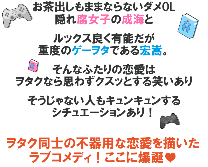 隠れ腐女子のOL・成海(なるみ)と、ルックス良く有能だが重度のゲーヲタである宏嵩(ひろたか)とのヲタク同士の不器用な恋愛を描いたラブコメディ。 『次にくるマンガ大賞2014』の“本にして欲しいWebマンガ部門”第1位、pixiv内オリジナルコミックブックマーク数歴代1位の大人気作品が多数の描き下ろしを加えて待望の書籍化。 電子書籍 全巻セット 紙書籍 全巻セット